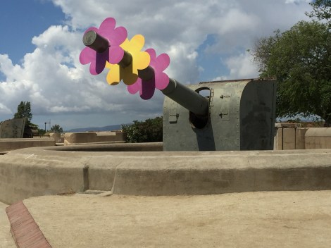 When we were there, the gun had no flowers but it was fun seeing and remembering the big fort. Did you look at the Olympic track there (and Nadal’s footprint)?